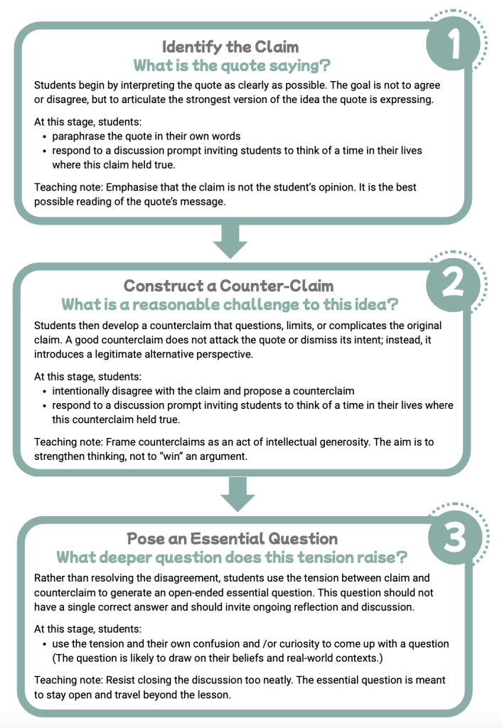 When selecting quotes for dialogue, choose text linked to big ideas such as belonging, fairness, resilience, courage or justice. A curated list of such quotes is available for download in the resource list at the bottom of the post. Invite students to bring quotes that matter to them, from books, speeches, songs, or admired thinkers, to build ownership and widen representation in class discussions.